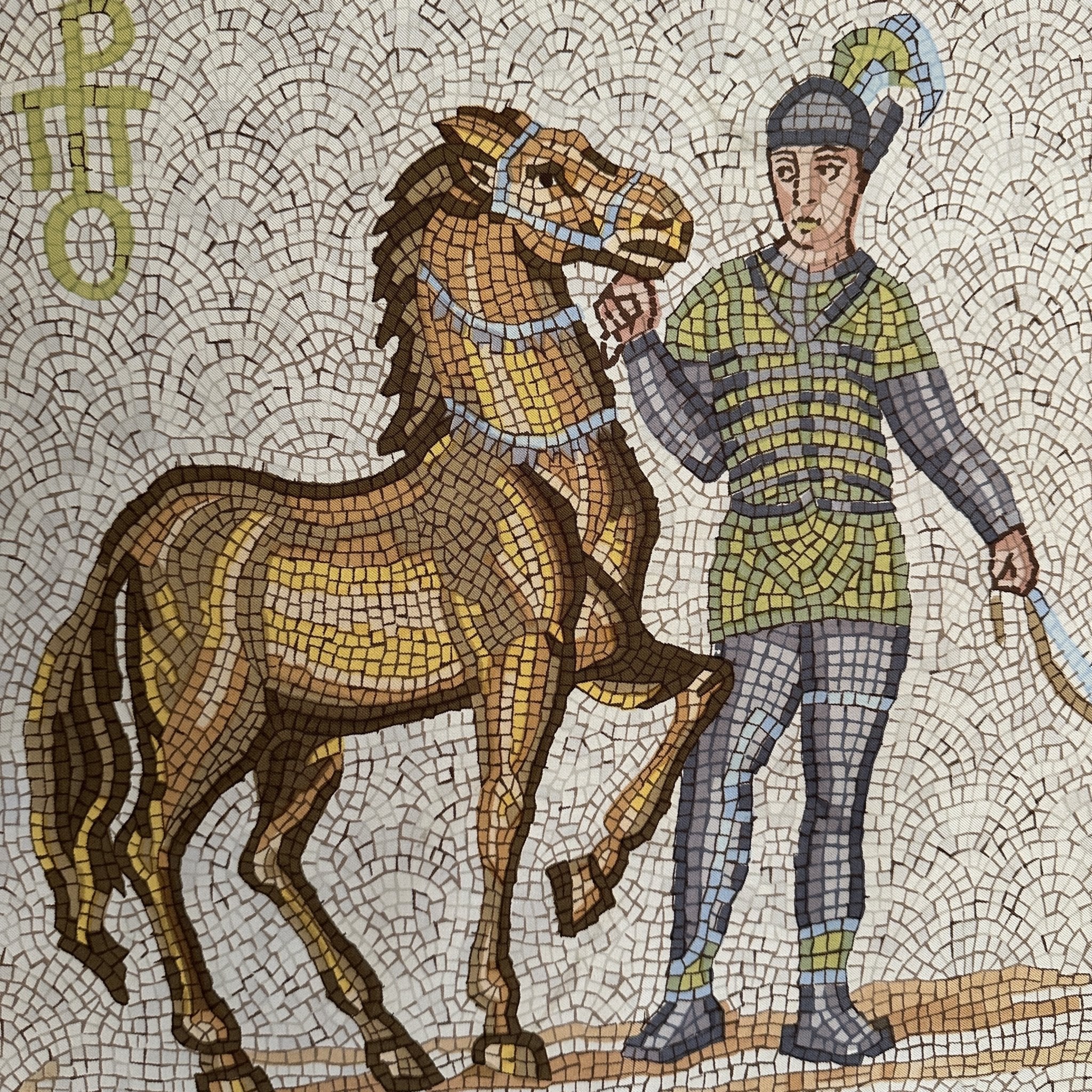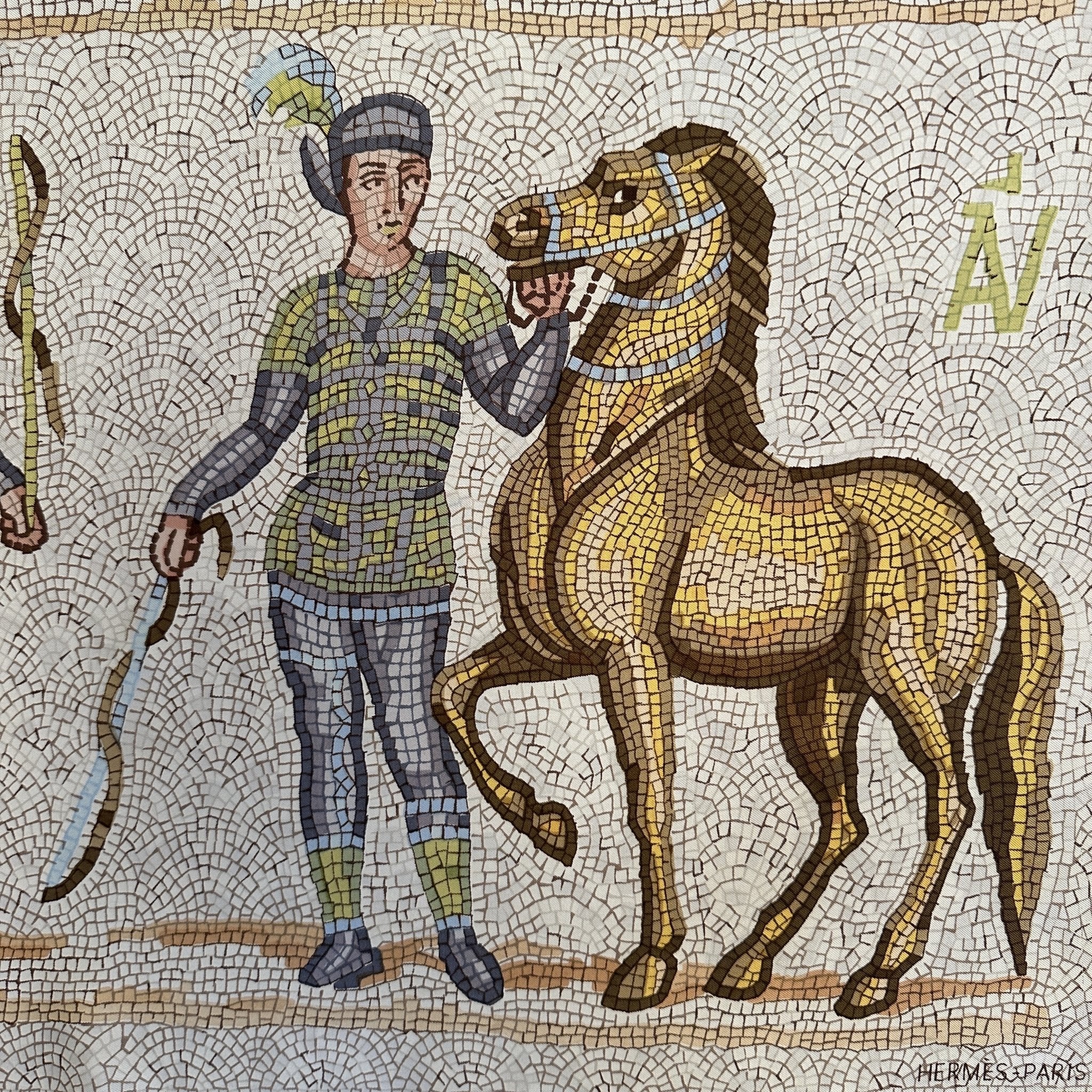 Ce carré illustre cet univers empreint de puissance et d'élégance, s'inscrivant parfaitement dans l'héritage équestre d'Hermès. La symbolique du cheval, omniprésente dans les créations de la maison, s'enrichit ici d'un hommage aux traditions antiques, où l'art et l'histoire se conjuguent pour sublimer cette œuvre exceptionnelle.