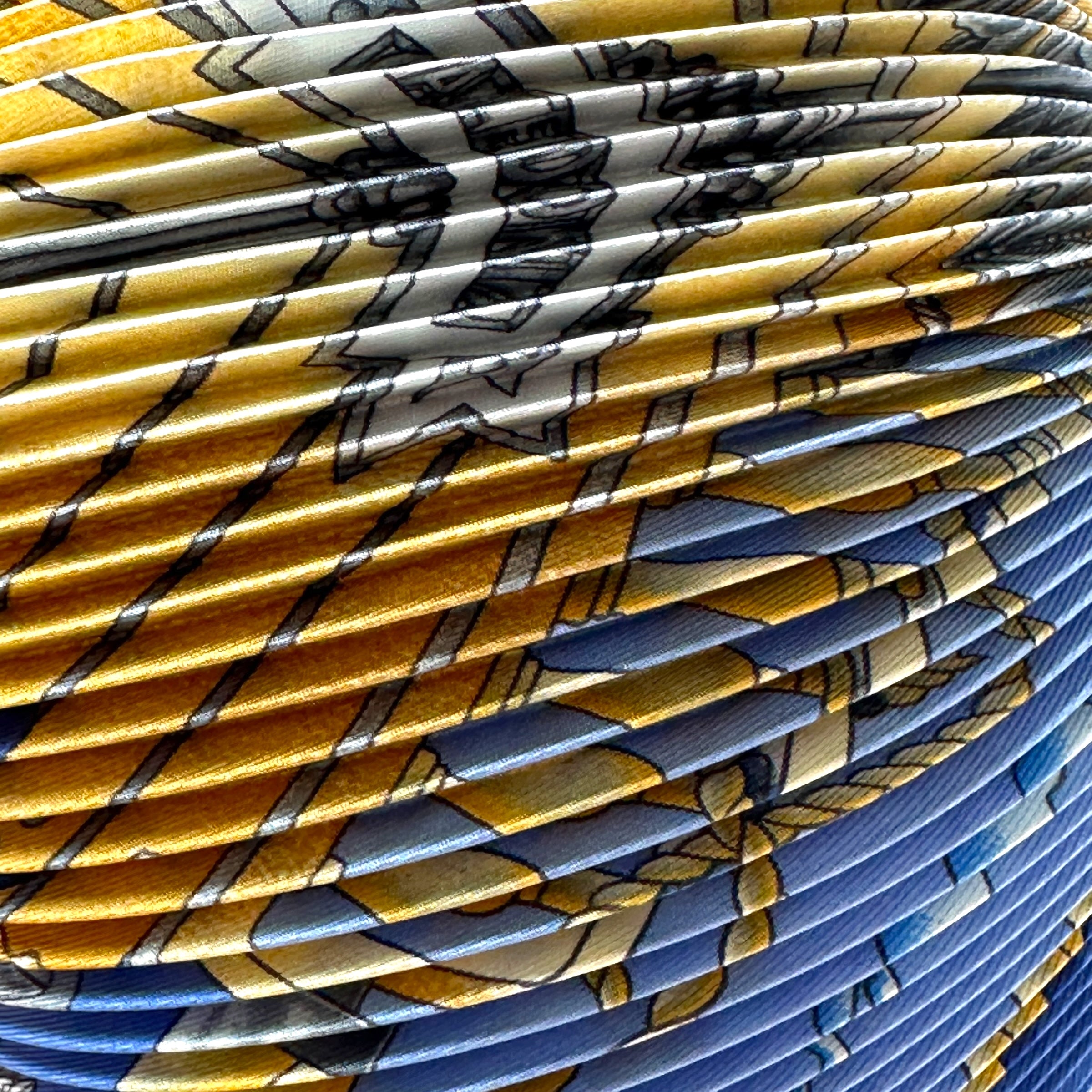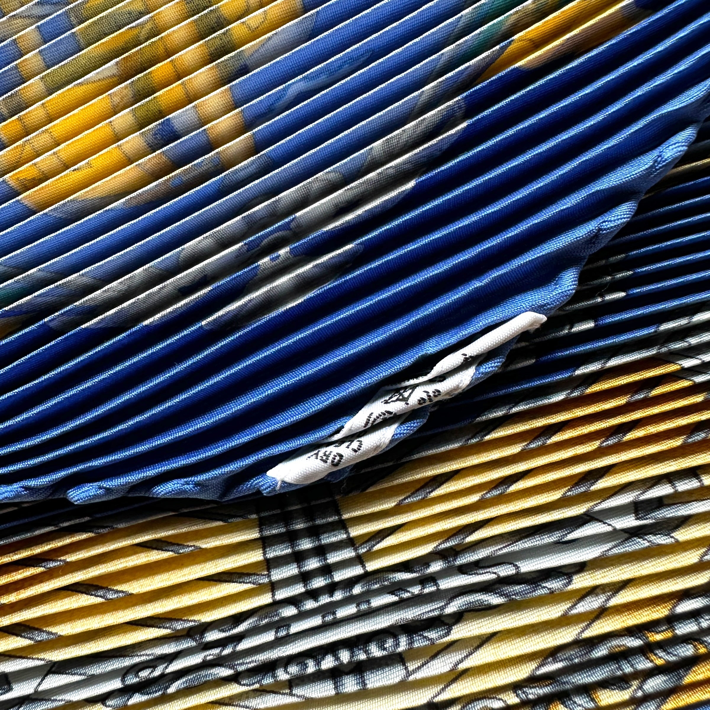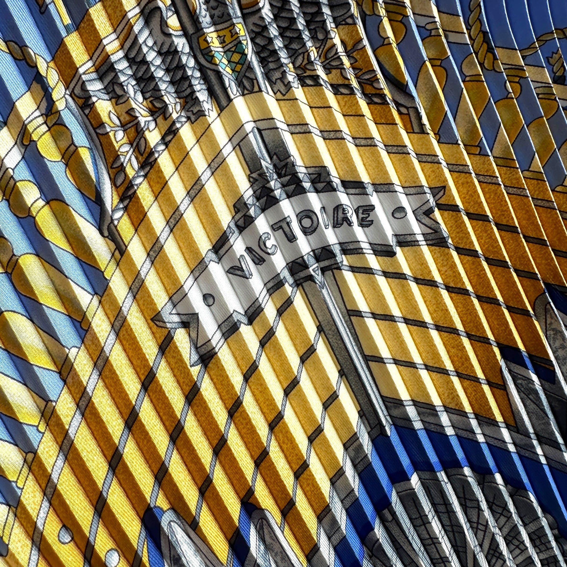 Les carrés plissés Hermès sont une déclinaison sculpturale du classique 90 × 90. La soie est plissée après impression du motif, dans un procédé délicat qui crée une texture tridimensionnelle unique.