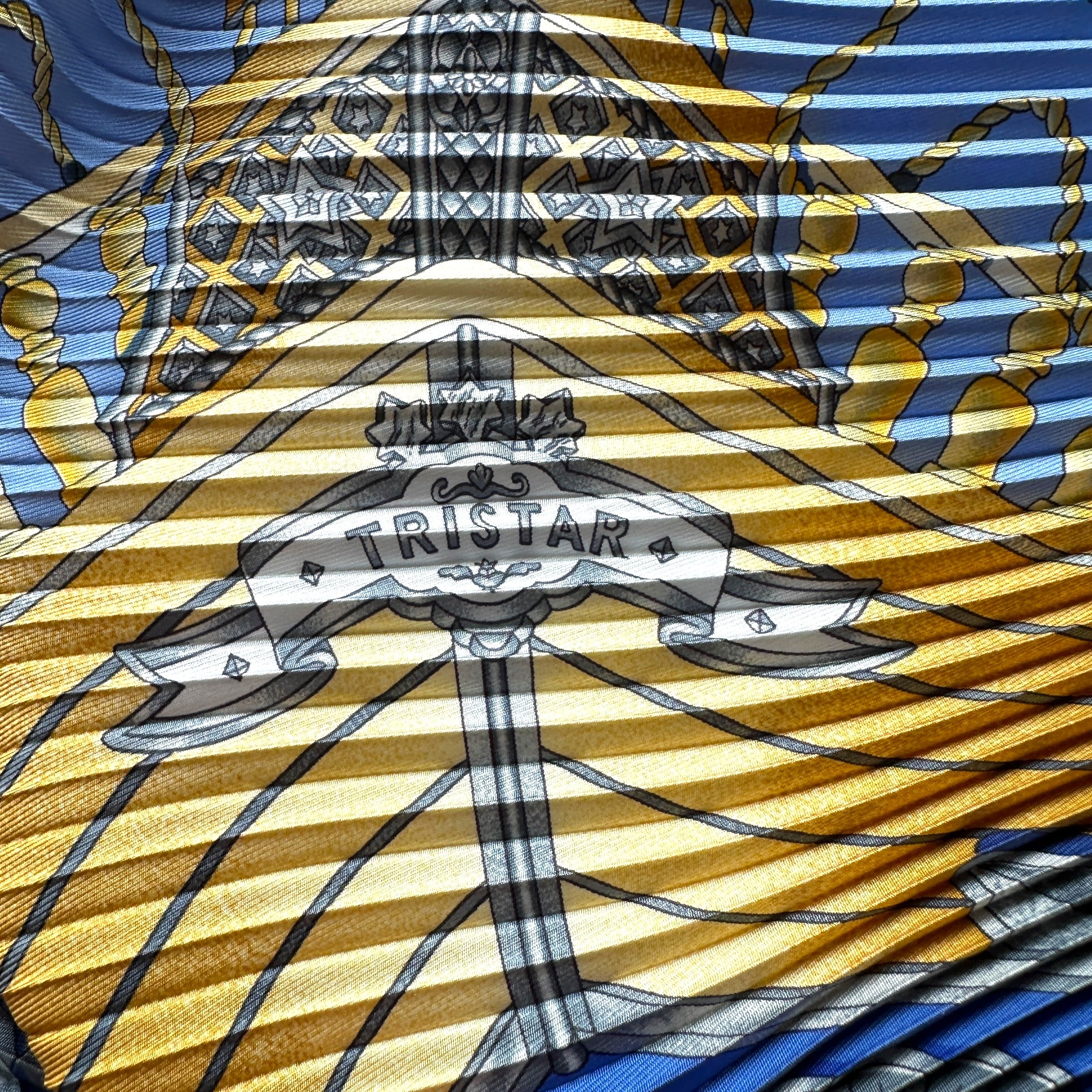 Créé en 1998 par Joachim Metz, Railing est un carré rare et sophistiqué, jamais réédité par Hermès. Cette version plissée, très élégante, fait partie des formats les plus recherchés des collectionneurs. Elle séduit par sa texture originale et son format très facile à porter.