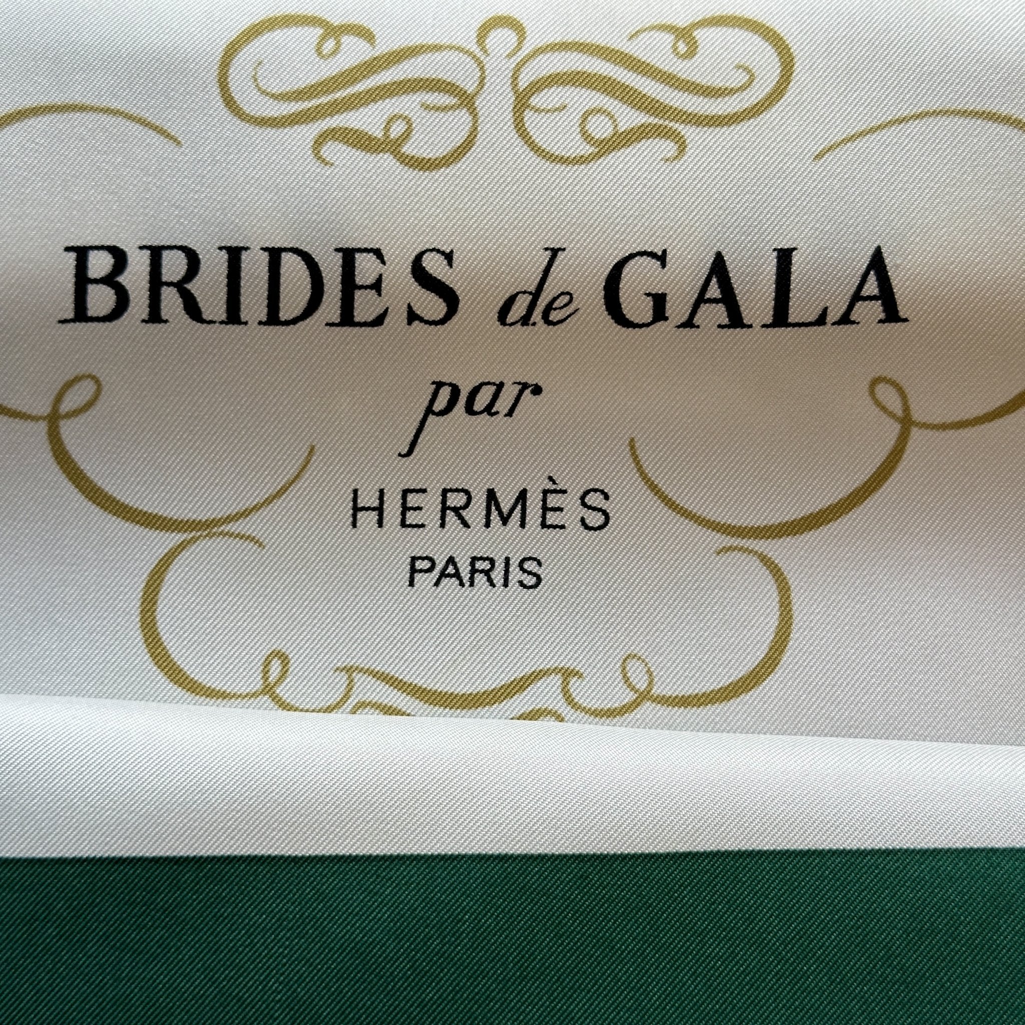 Intemporel et universel, ce foulard est une pièce de collection à transmettre comme un héritage. La version présentée ici associe une palette vert et or à un fond blanc perle, rehaussée par un encadrement vert profond.