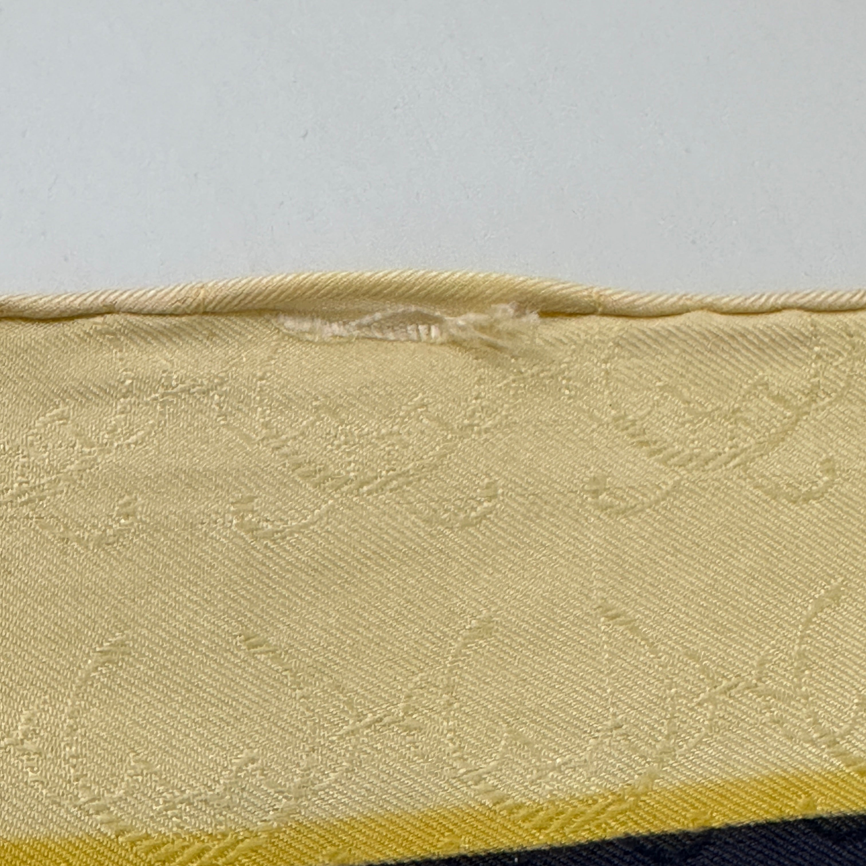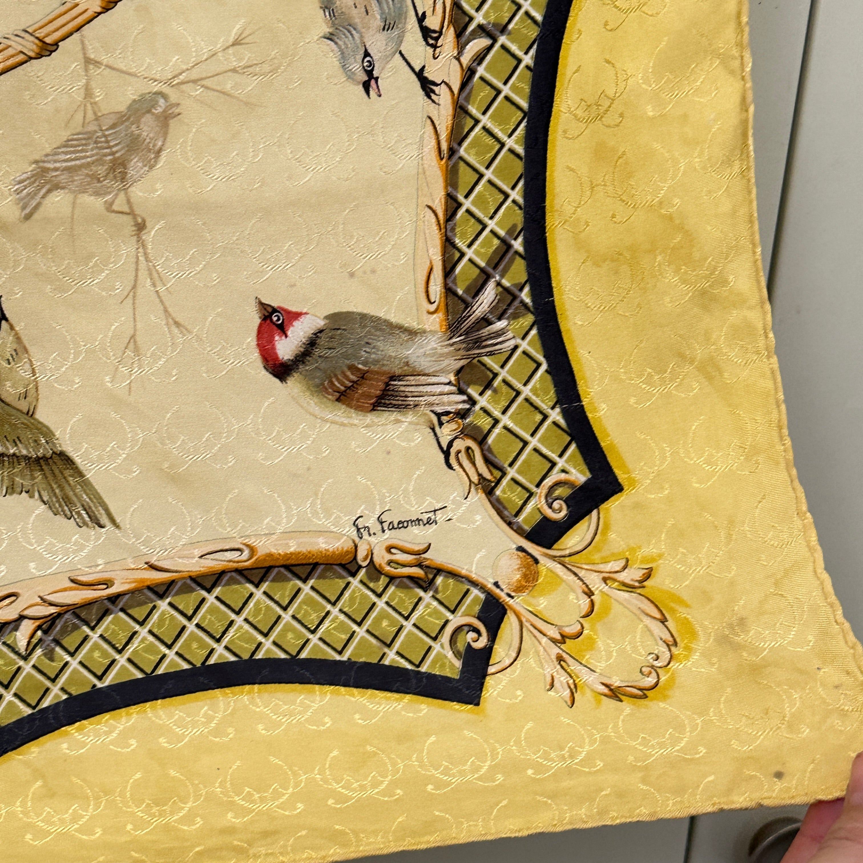 Moineaux, mésange, chardoneret, moineaux... Un superbe foulard en soie brochée qui rend hommage à la nature et les oiseaux. Édité en 1965, ce carré sera réédité en 1990 et 1995. Celui-ci fait partie de la première édition. Palette jaune pastel, gris, fond blanc. En bon état, présence de tâches, salissures et fils tirés, accroc. Roulotté légèrement décousu sur 3 cm. Malgré ces défauts (visibles sur les photos) du à son âge, il reste très beau. Rare et recherché par les collectionneurs, surtout dans cette couleur. Avec boîte.